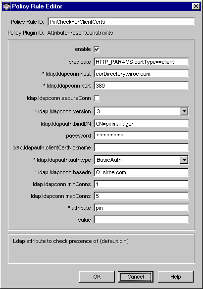 The configuration shown in Figure 3-2 creates a policy rule named PinCheckForClientCerts, which enforces a rule that the server should check for users PINs in the specified LDAP directory.