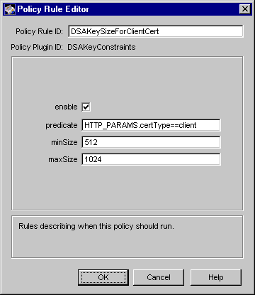 The configuration shown in Figure 3-3 creates a policy rule named DSAKeySizeForClientCert, which enforces a rule that the server should restrict the minimum and maximum key sizes for all DSA key-based client certificates to 512 and 1024, respectively.