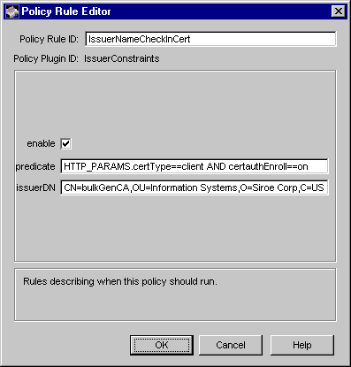 The configuration shown in Figure 3-4 creates a policy rule named IssuerNameCheckInCert, which enforces a rule that the server should check for certificates issued by a CA, whose issuer DN is CN=bulkGenCA,OU=Information Systems,O=Siroe Corp,C=US.