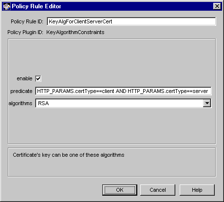 The KeyAlgorithmConstraints plug-in module implements the key algorithm constraints policy. This policy restricts the key algorithm requested in certificates to the algorithms, such as RSA and DSA, supported by Certificate Management System. In other words, this policy allows you to set restrictions on the types of public keys certified by Certificate Management System.