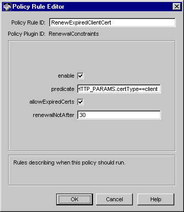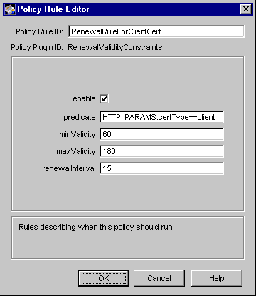 The predicate expression is left blank so that the rule is applied to all certificate enrollment and renewal requests processed by the server. For details on individual parameters defined in the rule, see Table 3-12. You need to review this rule and make the changes appropriate for your PKI setup. For instructions, see section F"Step 2. Modify Existing Policy Rules" in Chapter 18, "Setting Up Policies" of CMS Installation and Setup Guide. For instructions on adding additional instances, see section "Step 4. Add New Policy Rules" in the same chapter.