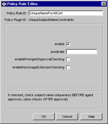 The configuration shown in Figure 3-12 creates a policy rule named UniqueNameForAllCert, which enforces a rule that all certificates must have unique subject names.