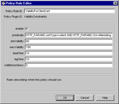The predicate expression is left blank so that the rule is applied to all certificate enrollment and renewal requests processed by the server. For details on individual parameters defined in the rule, see Table 3-12. You need to review this rule and make the changes appropriate for your PKI setup. For instructions, see section "Step 2. Modify Existing Policy Rules" in Chapter 18, "Setting Up Policies" of CMS Installation and Setup Guide. For instructions on adding additional instances, see section "Step 4. Add New Policy Rules" in the same chapter.
