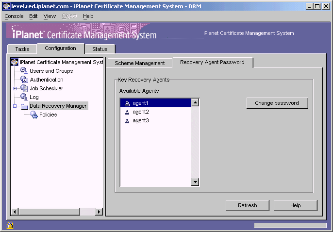 The Data Recovery Manager tracks the key recovery agent password for each agent and allows you to facilitate changing agents' passwords; you do not have direct access to these passwords or the actual storage key password. Each password retrieves only a part of the private storage key.