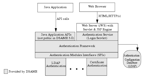 DSAME authentication provides two client interfaces, only one of which is exposed in DSAME 5.0the Authentication Service which provides an HTML over HTTP interface. (A "public" or "exposed" interface is one that customers can customize to create their own service or module.) Application developers can customize the HTML templates to create new authentication login, logout, and timeout screens. (For more information, see Chapter 3 "HTML Templates.)Although there are two client interfaces, both use the same underlying authentication framework and authentication modules. Figure 2-1 shows the different authentication components and how they interact within the authentication architecture.