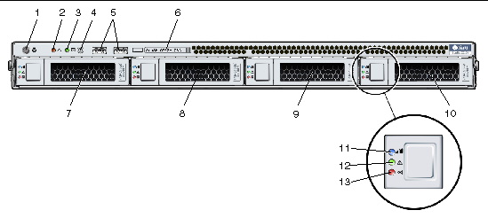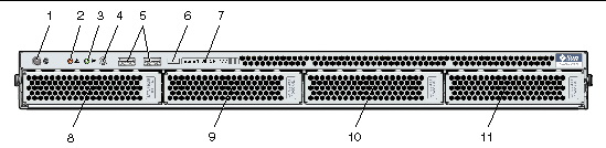 For servers with an SP module, in standby power mode, the Power/OK LED on the front panel flashes. Depending on your server configuration, see either FIGURE 1-3 or FIGURE 1-4.
