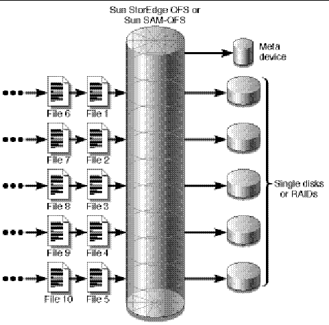 By default, Sun StorEdge QFS and Sun StorEdge SAM-FS file systems use a striped allocation method to spread data over all the devices in the file system family set. Striping is a method of writing files in an interlaced fashion across multiple devices concurrently.
