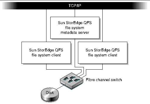 A Sun StorEdge QFS or Sun SAM-QFS shared file system is a distributed, multihost file system that you can mount on multiple Solaris operating system (OS) hosts. One Solaris OS host acts as the metadata server, and the others are clients. If you want the ability to change the metadata server, you must designate one or more clients as potential metadata servers.