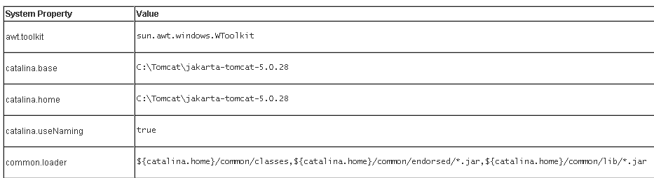 - Java System Properties: Select this tab to view the Java system properties and property values currently being used by your current working environment.