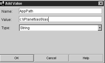 - Create a value for this subkey, which defines the attributes of the Common Name (cn) that is defined in Directory Server. For example: root=cn=global,cn=iasconfig,cn=iAScluster,O=NetscapeRoot.