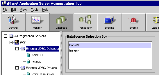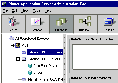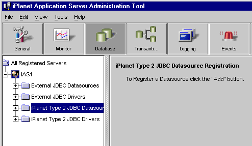 - Click the + sign next to the registered iPlanet Application Server to see all the database options.