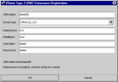 The Driver Name is a logical name by which you identify the driver to iPlanet Application Server. This name is used to link datasource definitions back to a physical driver type. The name can be of any string value you choose. Examples include: driver1,ora-type4, ora-type2, and jconnect.