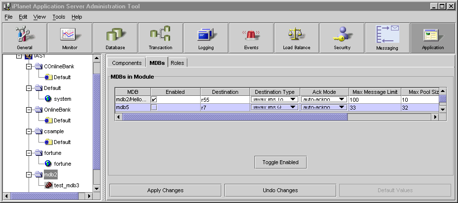 Message-driven beans can now be administered through the iPlanet Application Server Administration Tool. You can change the properties of each individual message-driven bean in a module.