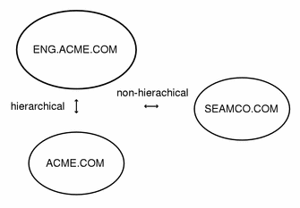 A realm is a logical network, like a domain, which defines a group of systems under the same master KDC (see below). Figure 1-3 shows how realms can relate to one another. Some realms are hierarchical (one being a superset of the other). Otherwise the realms are non-hiearchical and the mapping between the two realms must be defined. A feature of SEAM is that it permits authentication across realms; each realm only needs to have a principal entry for the other realm in its KDC.