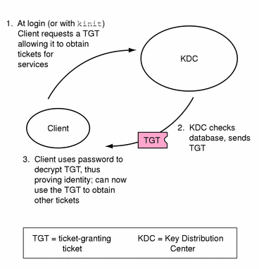 A client (a user, or a service such as NFS) begins a SEAM session by requesting a ticket-granting ticket (TGT) from the Key Distribution Center. This is often done automatically at login.