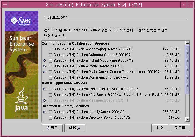 Á¦°ÅÇÒ ±¸¼º ¿ä¼Ò¸¦ ¼±ÅÃÇÏ·Á¸é±¸¼º ¿ä¼Ò ¼±Åà ÆäÀÌÁö¿¡´Â ½Ã½ºÅÛ¿¡¼ »ç¿ëÇÒ ¼ö ÀÖ´Â Java Enterprise System ±¸¼º ¿ä¼Ò°¡ ¸ðµÎ ³ª¿µË´Ï´Ù.