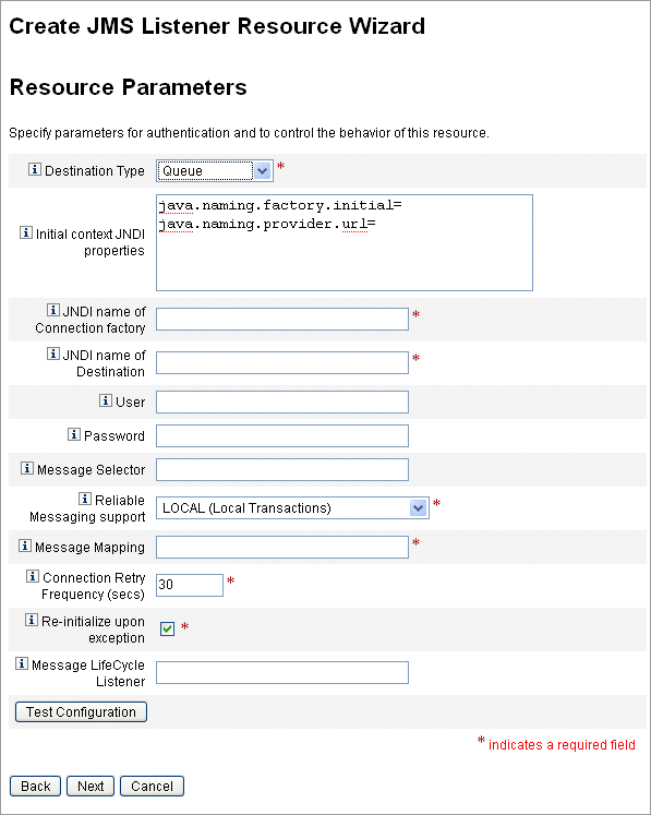 - 「User」には、新しいメッセージをキューに送る JMS ユーザー名を指定します。