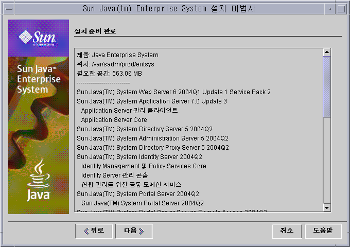 ���� �������̽��� ����Ͽ� ����Ʈ���� ��ġ�� �忡���� ��ġ �wα��� ��ȭ�� ���� �������̽��� ����Ͽ� Java Enterprise System ����Ʈ��� ��ġ�ϴ� ��ħ; f���մϴ�. �� �忡 ����� �۾�; �����Ϸx� 2��, “��ġ �غ�”�� ���� �ִ� �۾�; ���� �Ϸ��ؾ� �մϴ�.