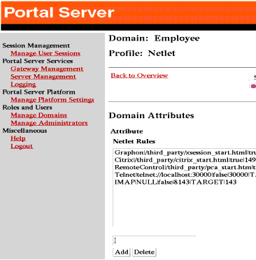 When access to a non-Web-based application or a TCP application is needed by your employees, it will become necessary to set up a netlet for communication. A netlet creates a virtual private network on the fly without the need for client software.The following netlet example allows employees remote access to the Netscape Mail client on their browser as if they were at their corporate workstation on the intranet. A similar netlet may be configured for other secure TCP access such as telnet or remote desktop display.