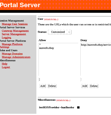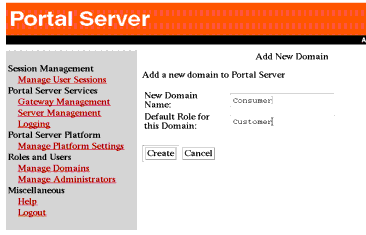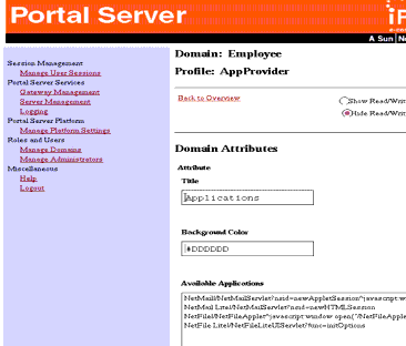 This chapter is provided to quickly become productive in setting up and managing a corporate intranet portal using iPlanet Portal Server. In this case, the portal will consist of two domains; one for a business to consumer (b-c) solution and one for a business to employee (b-e) solution. The tasks described are to be performed by the Super Administrator unless otherwise noted.Portions of setting up a multi-domain portal can be done by a delegated Domain Administrator. For each domain, there can be one or more domain admin roles or users. However, domain admin roles and users are assigned to one domain only. No domain admin role or user can be assigned to more than domain.