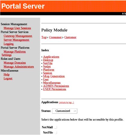 Verify that the Applications list on the right side of the content window does not include Netfile or Netmail. Also, attempt to start the NetFile application directly by typing the URL http://server:8080/NetFileApplet in the Bookmarks text box. The policy check returns a denial of service message.