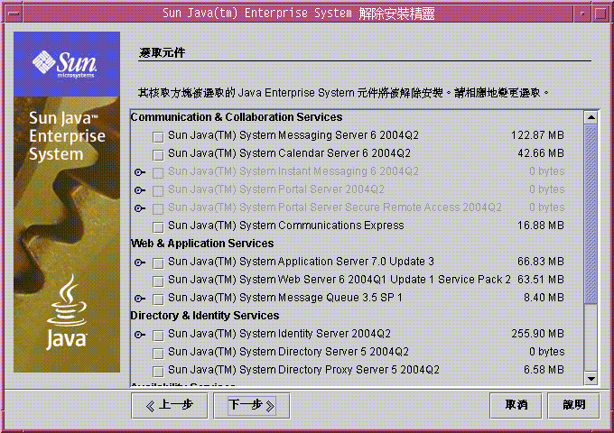 - 解除安裝程式僅移除由 Java Enterprise System 安裝程式安裝的元件產品。若要移除不是由 Java Enterprise System 安裝程式所安裝的元件產品,請按照元件產品的說明文件中的說明執行。