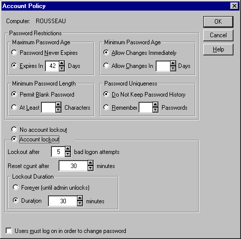 管理ツールを開きます (「スタート (Start)」 > 「プログラム (Programs)」 > 「管理ツール (Administrative Tools)」 > 「ユーザーマネージャ (User Manager)」)。「原則(Policies)」メニューの「アカウント (Account)」を選択して「アカウントの原則 (Account Policies)」ウィンドウを表示します。ロックアウトするアカウントのチェックボックスを選択します。