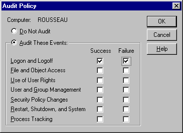 次に、「原則 (Policies)」メニューの「監査 (Audit)」を選択します。ダイアログで「監査するイベント (Audit These Events)」を選択し、「ログオンとログオフ (Logon and Logoff)」イベントの「成功 (Success)」および「失敗 (Failure)」ボックスの両方にチェックマークを付けます。