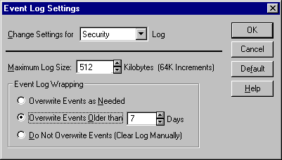 イベントビューアを開き (「スタート (Start)」 > 「プログラム (Programs)」 > 「管理ツール (Administrative Tools)」 > 「イベントビューア (Event Viewer)」)、「イベントログの処理」 (「ログ (Log)」 > 「ログの設定 (Log Settings)」にある) の値をユーザの導入に適した値に設定します。