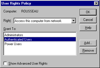次に、「原則 (Policies)」メニューの「ユーザーの権利 (User Rights)」を選択します。「ネットワーク経由でコンピュータへアクセス (Access this computer from the network)」を選択して、「Everyone」を削除し、リストに「Authenticated Users」を追加します。