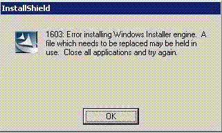 - Error 1603 - Fatal error during installation: This can happen due to any of the causes mentioned at the Microsoft website: http://support.microsoft.com/default.aspx?scid=kb;en-us;834484