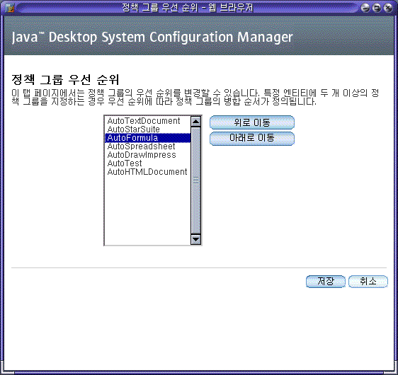 정책 그룹 테이블은 페이지 맨 위에 있으며 정책 그룹이 나열됩니다. 이 테이블에는선택 열, "이름" 및 "우선 순위" 열이 있습니다. 그림 2–10을 참조하십시오.