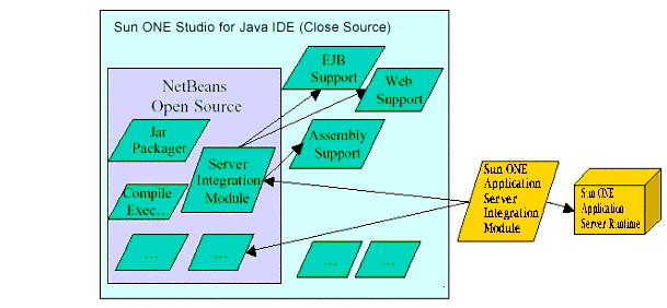 As shown in the following figure, the Sun ONE Application Server 7 integration module relies upon the NetBeans Open Source modules that are implemented from the Sun ONE Studio Close Source.
