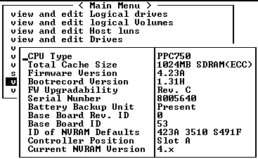 In the example above, the Firmware Version is 4.23A. This is the version of RAID controller firmware that is running on your active controller. The ID of NVRAM Defaults description shows that the expected version of NVRAM for this firmware version is 423A. The Current NVRAM Version description is 4.x. This shows that there is no serious discrepancy between what is expected and what is present on your active controller.
