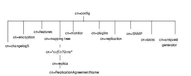 The following diagram shows how the configuration data fits within the cn=config Directory Information Tree.