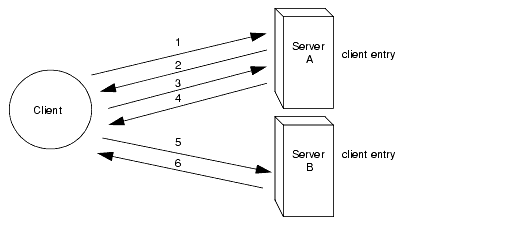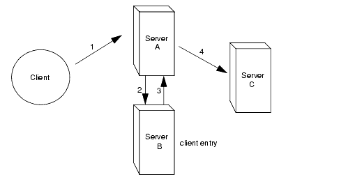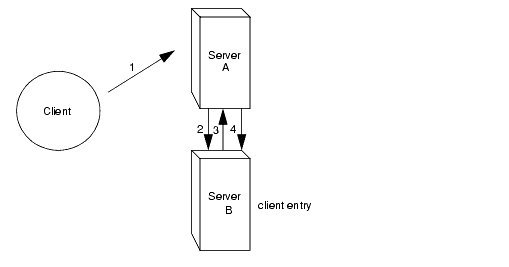 Server A does not contain an entry corresponding to the client application. Instead, it contains a database link to Server B, which contains the actual entry of the client. Server A sends a bind request to Server B.