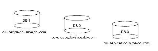 When you divide your directory tree across several databases, each database contains a portion of your directory tree, called a suffix. For example, you can use a database to store the entries in the ou=people,dc=siroe,dc=com suffix, or branch, of your directory tree.