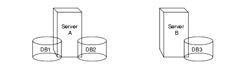 When you divide your directory tree among a number of databases, these databases can then be distributed across multiple servers. For example, the three databases you created to contain the three suffixes of your directory tree can be stored on two servers as follows: