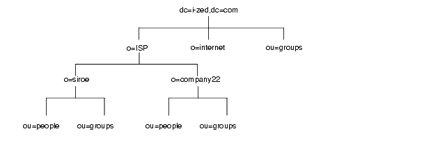 The dc=i-zed,dc=com entry represents a root suffix. The entry for each hosted ISP is also a root suffix (o=siroe and o=company22). The ou=people and the ou=groups branches are sub suffixes under each root suffix.