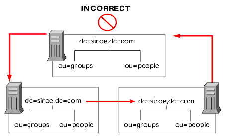 Deploying your directory using a complex web of referrals makes administration difficult. Also, overusing smart referrals can lead to circular referral patterns. For example, a referral points to an LDAP URL, this LDAP URL in turn points to another LDAP URL, and so on until a referral somewhere in the chain points back to the original server. The following diagram depicts a circular referral pattern: