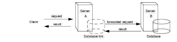 During chaining, a server receives a request from a client application for data it does not contain. Using the database link, the server then contacts other servers on behalf of the client application and returns the results to the client application. This operation is illustrated in the following diagram.