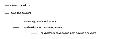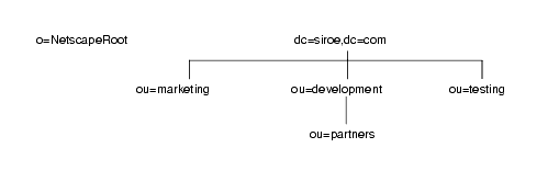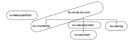 The o=NetscapeRoot and dc=siroe,dc=com suffixes are both root suffixes. The other ou=testing,dc=siroe,dc=com suffix, the ou=development,dc=siroe,dc=com suffix and the ou=partners,ou=development,odc=siroe,dc=com suffix are all sub suffixes of the dc=siroe,dc=com root suffix. The root suffix dc=siroe,dc=com contains the data in the ou=marketing, branch of the original directory tree.