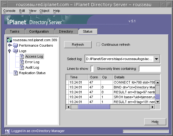 目的の操作を実行するために必要なアクセス権を持つユーザのバインド DN とパスワードを使用してログインします。たとえば、cn=Directory Manager とこれに対応する適切なパスワードを使用します。