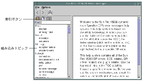 標準的な JavaHelp システムビューア hsviewer によって、DR エラーメッセージヘルプシステムが表示されます。このビューアは、図 3-1 に示すように、ツールバーと 2 つの区画 (内容区画とナビゲーション区画) からなります。
