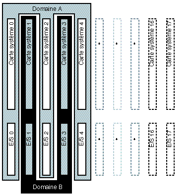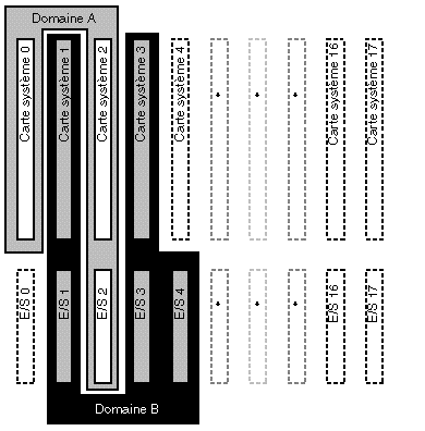 Le domaine A contient les cartes système 0 et 2 et la carte d'E/S 2, tandis que le domaine B inclut les cartes système 1 et 3 et les cartes d'E/S 1, 3 et 4.