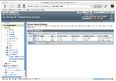 Clicking the Storage Systems link displays the Storage System Summary page, from which you can select an array to manage.