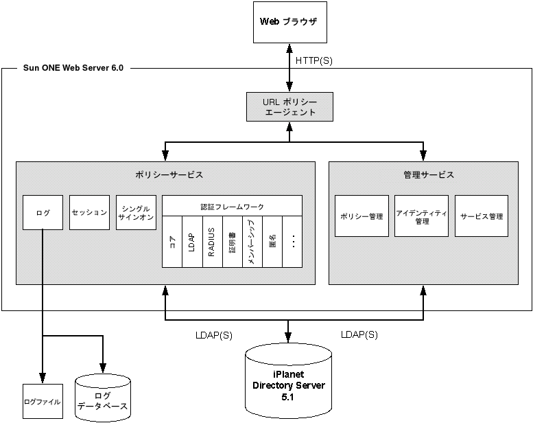 Sun ONE Web Server は、製品 CD にスタンドアロン製品として含まれてはいませんが、Identity Server ソリューションの重要部分です。Sun ONE Web Server は、ポリシーサービスと管理サービスのインストール時に自動的にインストールされ設定されます。バックグラウンドで動作するこの専用 Web Server インスタンスは、ポリシーの適用、アイデンティティの管理、およびサービス管理のためのエンジンを提供します。また、グラフィカルユーザインタフェースも提供します。