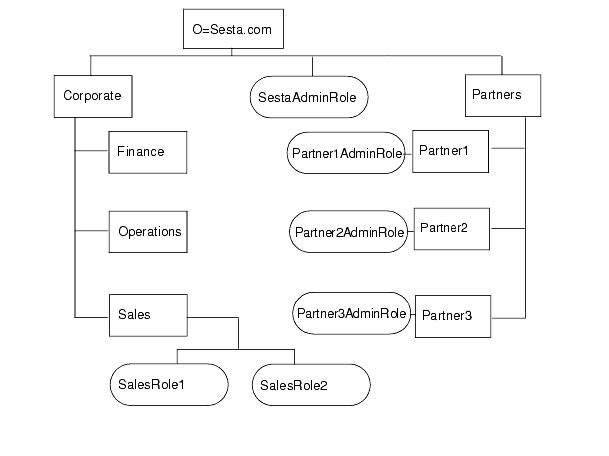 図 6-1 は、階層型ディレクトリ構造を示しています。この図では、最上位組織は Sesta.com です。最上位の 1 つ下には、組織と Corporate と Partners のサブ組織を管理する SestaAdminRole が置かれます。