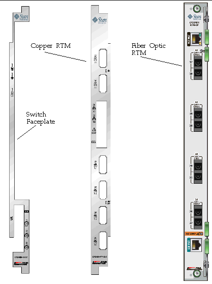 The following shows the Sun Netra CP3240 switch and the copper RTM (XCP3240H-RTM-CU-Z) and the fiber optic RTM (XCP3240H-RTM-OP-Z).