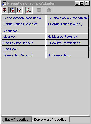 The adapter property sheet contains two tabs, one for basic properties and one for deployment properties. The property sheet toolbar at the top lets you choose how to display the properties in the selected tab (sorting options etc.).